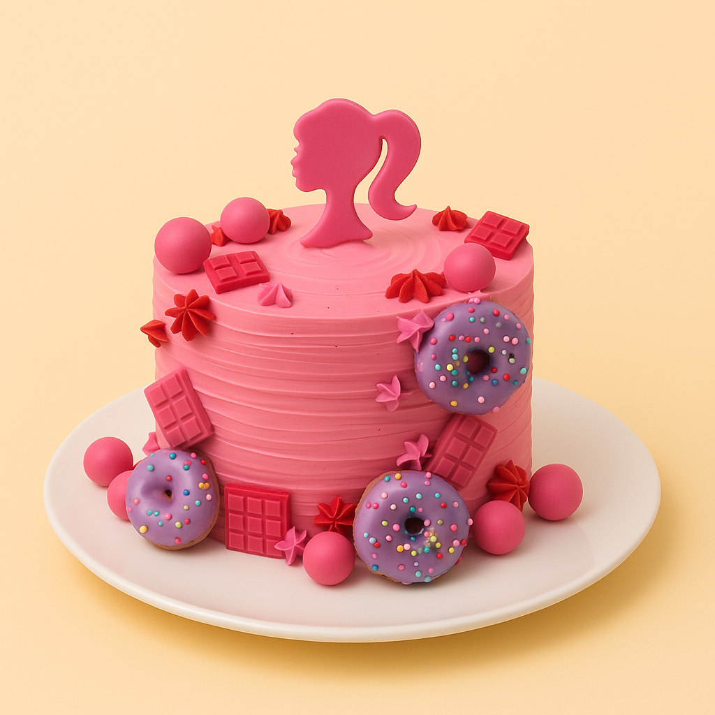 A stylish pink cake decorated with donuts, chocolates, and Barbie silhouette topper. A trendy design for fashion and Barbie lovers.