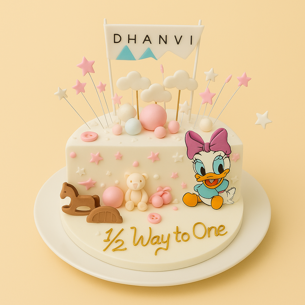 Adorable pastel-themed cake featuring Daisy Duck, playful stars, clouds, toys, and a custom name flag — a delightful way to celebrate your little one’s “½ way to one” milestone.