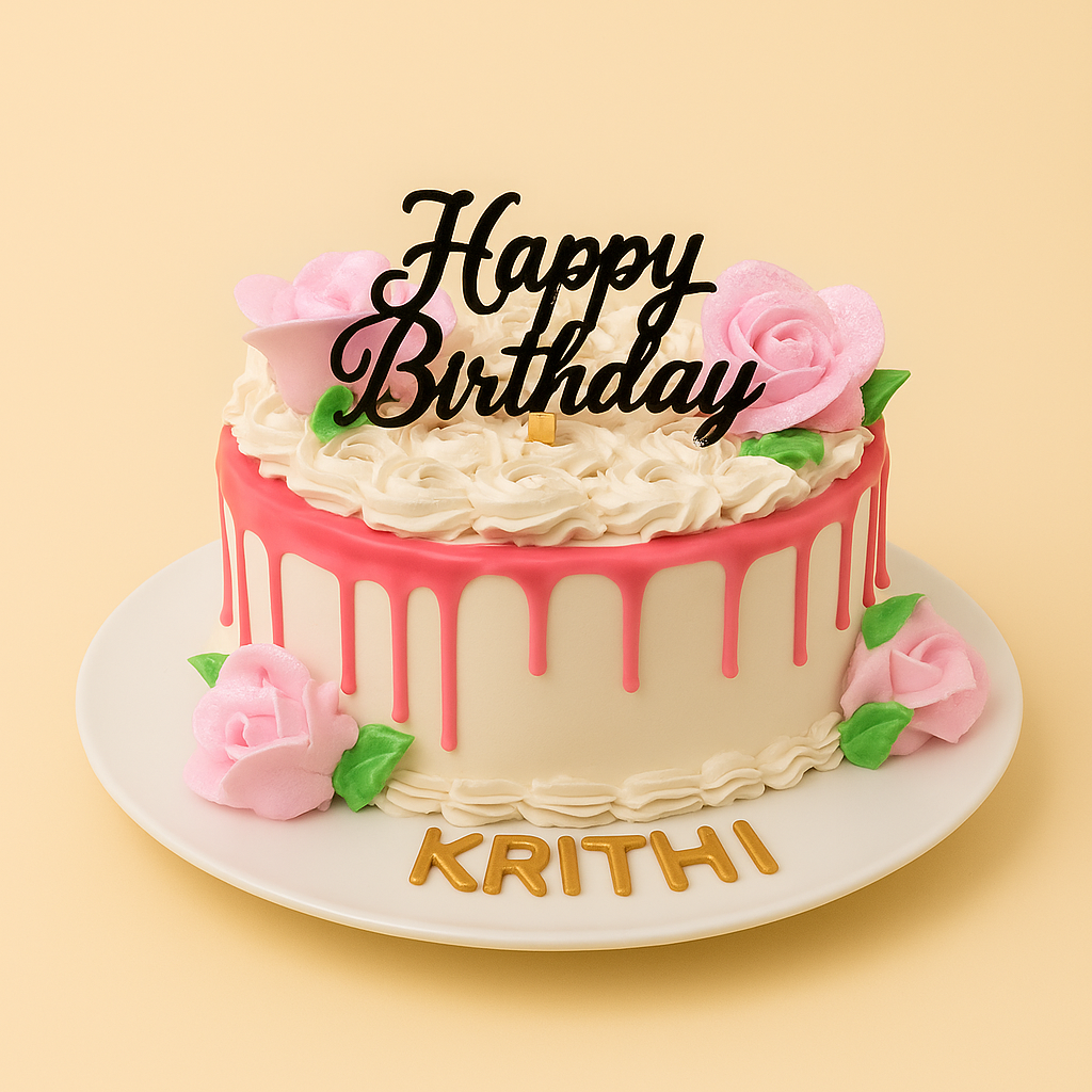 Classic cream cake with pink drip effect, topped with buttercream roses and “Happy Birthday” topper — simple yet graceful for birthdays.