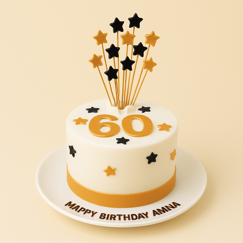 Elegant white & gold cake with black star accents and a tall star topper — ideal for milestone birthdays or grand celebrations.