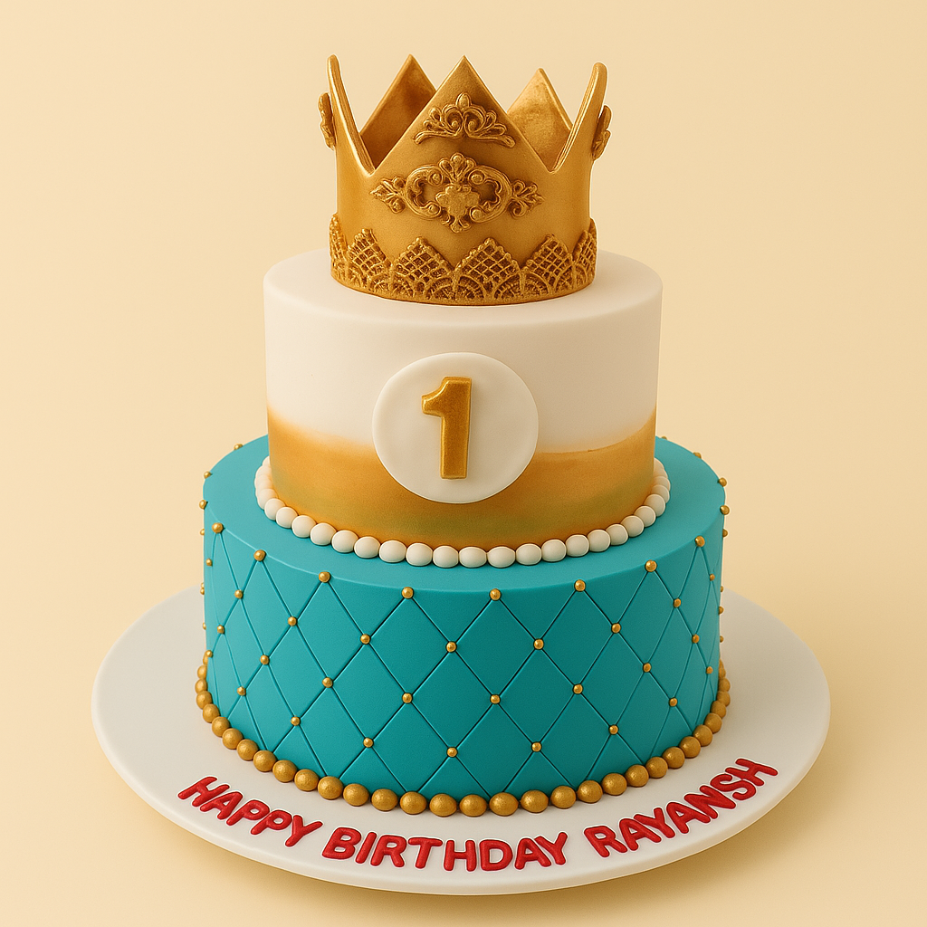 Two-tier turquoise and gold cake with a majestic crown topper — a royal centerpiece for a little prince’s first birthday.