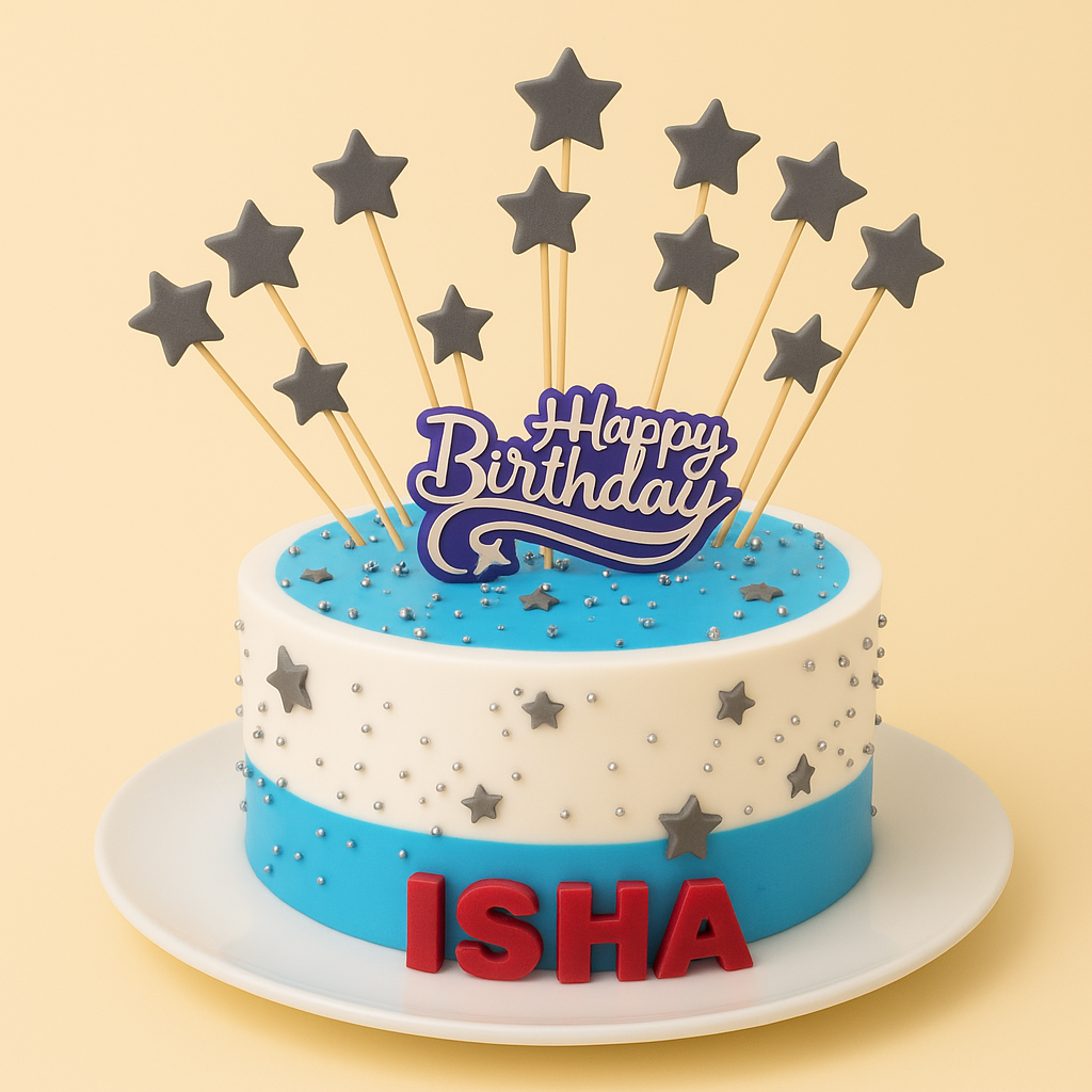 A white-and-blue cake with silver sprinkles and black star toppers. A sparkling design for birthdays under the stars theme.