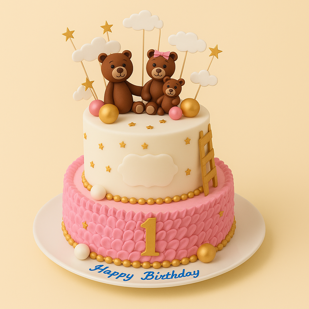 A delightful two-tier cake featuring an adorable teddy bear family, clouds, stars, and golden accents. Designed especially for first birthdays, this charming cake brings warmth, joy, and sweetness to the celebration.